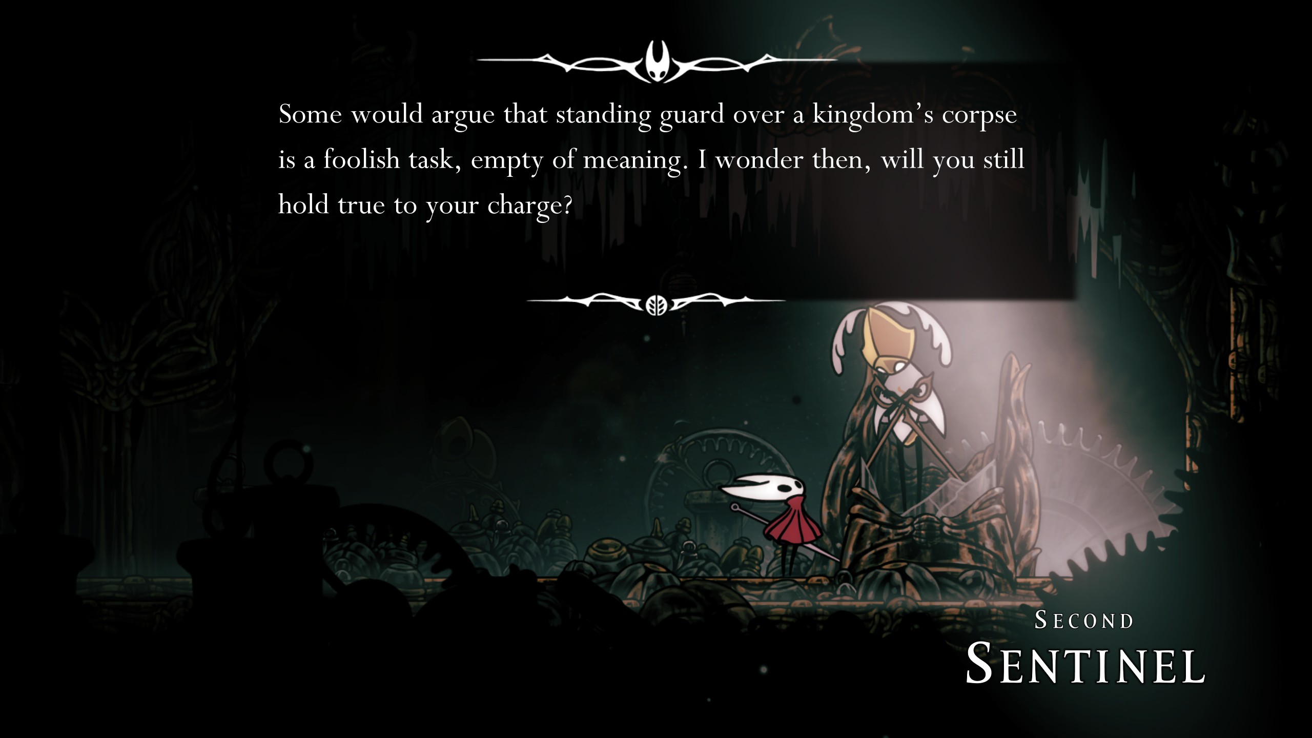 Hornet understands this. Though she begins her journey guarded, the more wishes you grant, the more she opens up. When taking on wishes, she inquires about her reward later and later into conversations and eventually not at all, caring only for how she can help the bug in question. After a time she remarks that she had forgotten the small warmth that comes from helping others. At the start of Silksong, she wants only to save herself, but by the end she is determined to save the whole kingdom.